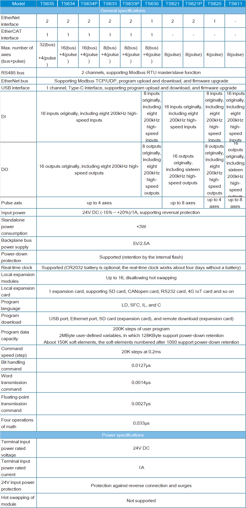 * Programiranje: Skladno s programskimi specifikacijami IEC61131. Podpira jezike LD, SFC, IL in C. Impulzne osi in osi vodila so združljive z nizom ukazov za krmiljenje osi. Podpora za grafično konfiguracijo z vlečenjem, preprosto nastavitev parametrov in samodejno dodeljevanje naslovov. Podpira funkcijo sledenja.